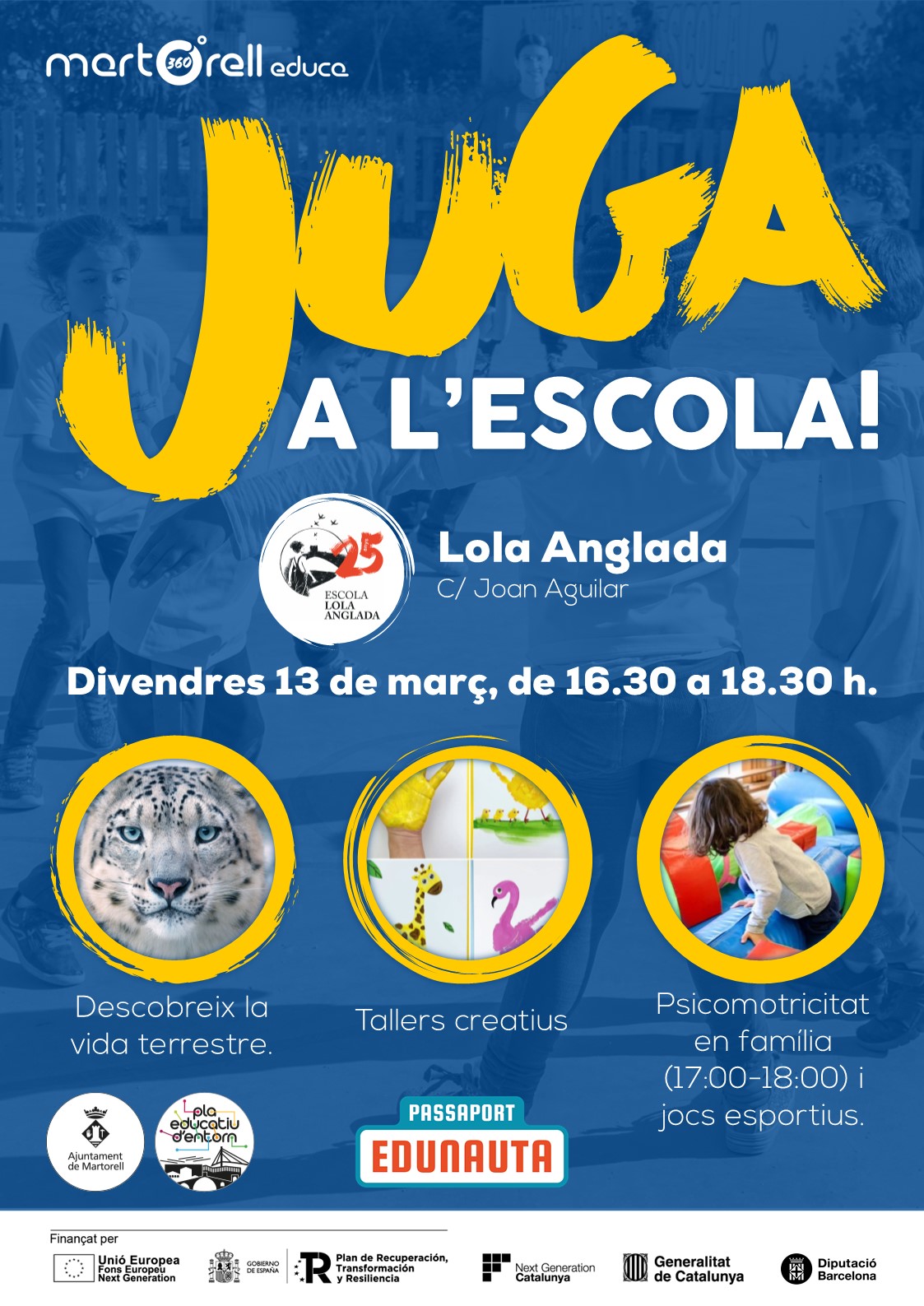 Aquest divendres, 13 de març, el pati de l’Escola Lola Anglada s’omplirà de jocs, tallers i activitats familiars amb una nova sessió del programa ‘Juga a l’Escola’. La proposta, adreçada als infants d’educació infantil i primària de Martorell i a les seves famílies, es farà de 16.30 a 18.30h i oferirà diverses activitats gratuïtes per gaudir d’una tarda lúdica.
