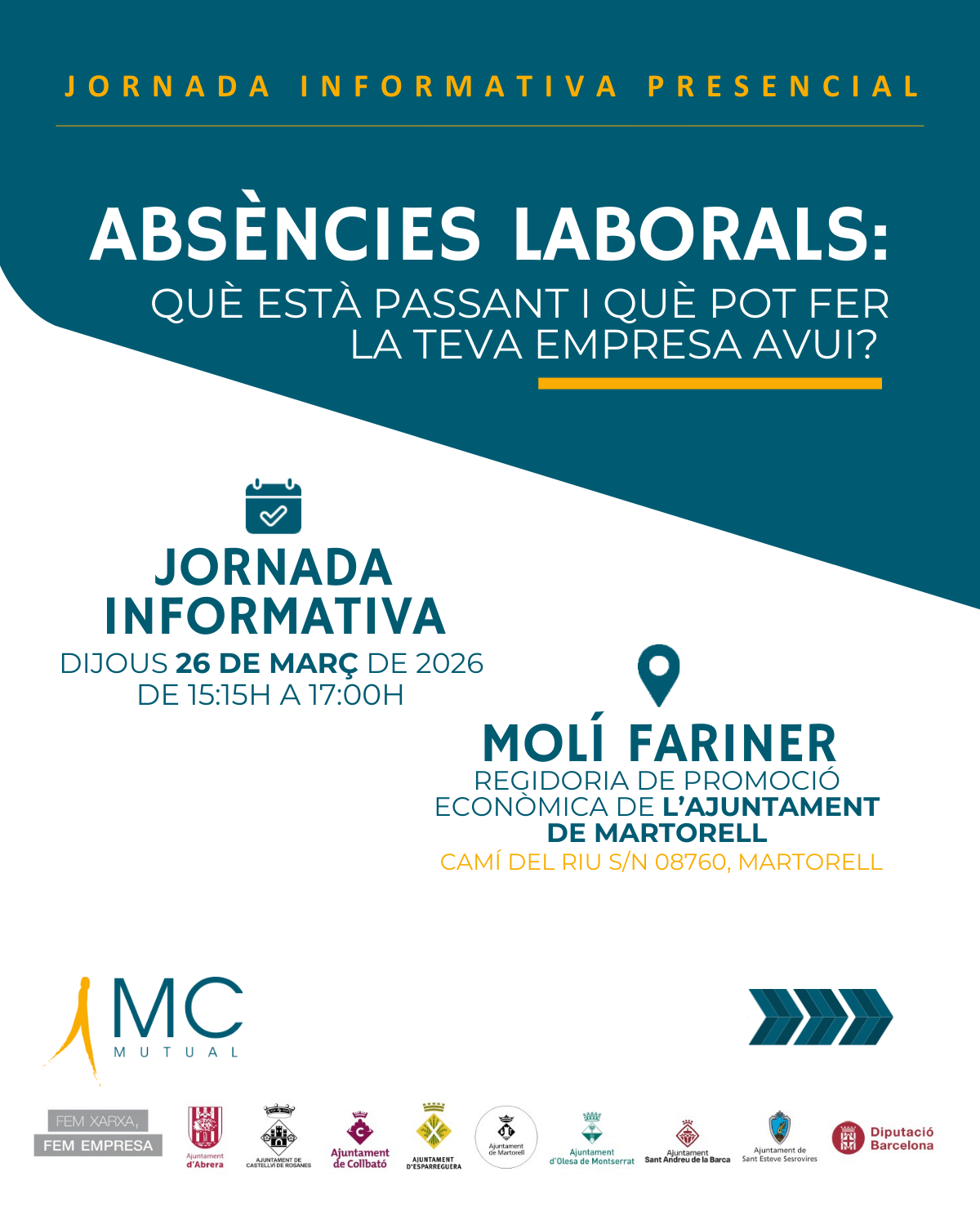 La Regidoria de Promoció Econòmica de l’Ajuntament de Martorell, en col·laboració amb la MC MUTUAL, ha obert les inscripcions per a la jornada informativa ‘Absències laborals. Què està passant i què pot fer la teva empresa avui?’. Una sessió adreçada a empreses, professionals de recursos humans i persones directives interessades a aprofundir en la gestió de les baixes laborals i el seu impacte en les organitzacions.