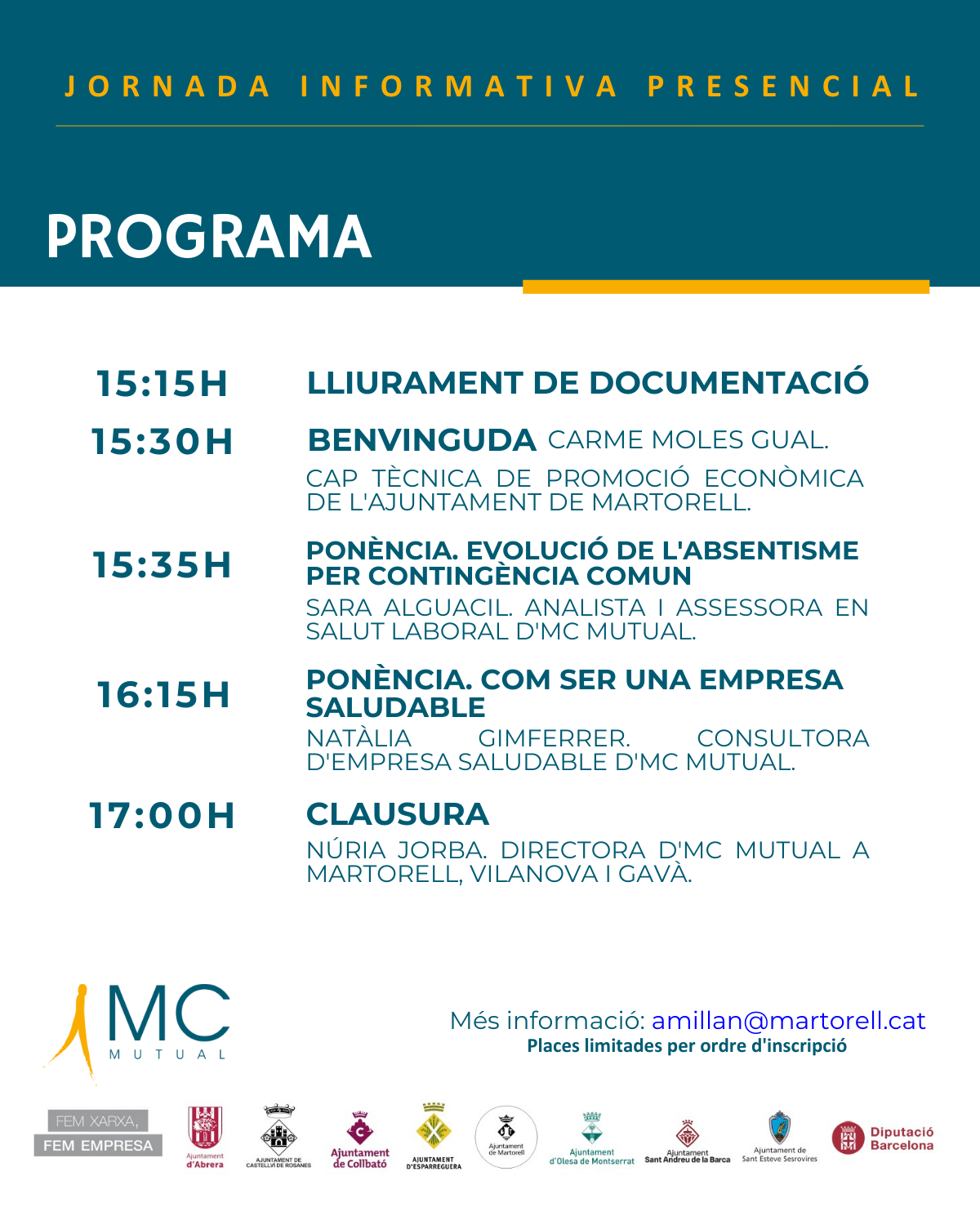 A les 16.15h, serà el torn de Natàlia Gimferrer, consultora d’Empresa Saludable d’MC MUTUAL, que impartirà la ponència ‘Com ser una empresa saludable’. En aquesta sessió es presentaran estratègies i bones pràctiques per fomentar entorns laborals més saludables, reduir l’absentisme i millorar el benestar de les persones treballadores. La cloenda, prevista a les 17.00h, anirà a càrrec de Núria Jorba, directora d’MC MUTUAL a Martorell, Vilanova i Gavà.