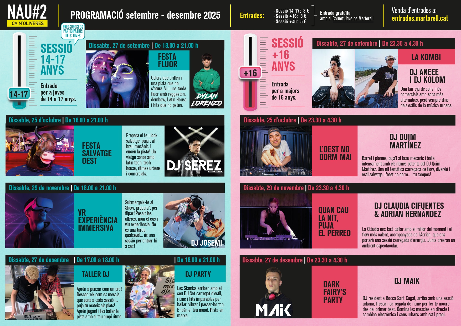 La Nau 2 de Ca n’Oliveres ofereix aquest octubre noves festes temàtiques pensades per al públic joves i no tan jove. Cada proposta combina música, ambientació i activitats especials, creant un espai on tothom pot ballar, retrobar-se amb amics i gaudir de nits úniques a Martorell. Una programació variada que inclou ‘Halloween‘, el ‘Salvatge Oest’ i la música retro dels 80 i 90.