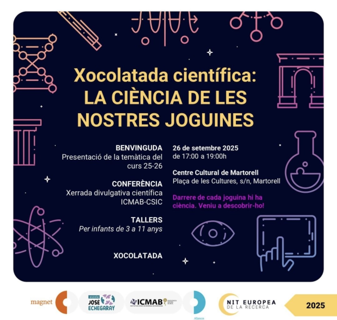 L’Escola José Echegaray se sumarà aquest divendres, 26 de setembre, a la Nit Europea de la Recerca. De 17.00 a 19.00h al Centre Cultural organitzaran la xocolatada científica ‘La nit de les nostres joguines’. Es gaudirà d’una conferència i tallers científics per descobrir la ciència que hi ha darrera de cada joguina.