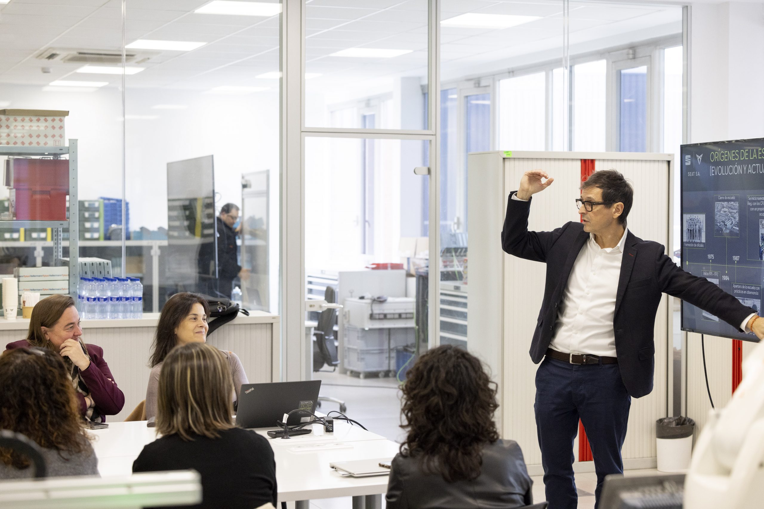 A continuació, es va fer la presentació de l’estratègia formativa de SEAT i del projecte de l’Escola de FP d’Aprenents, amb la participació dels mateixos representants institucionals, a l’aula principal del centre.
