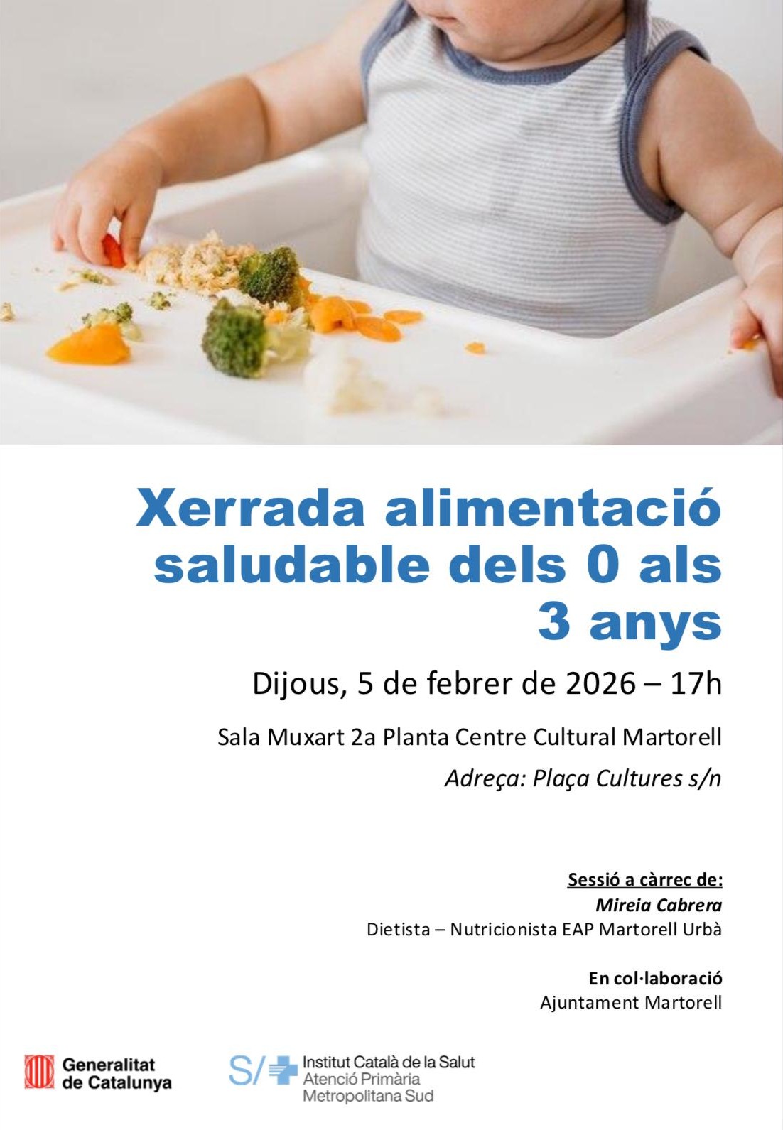 La resolució de dubtes de mares i pares al voltant de l’alimentació dels infants més menuts és l’objectiu de la xerrada de la dietista i nutricionista de l’Equip d’Atenció Primària (EAP) de Martorell, Mireia Cabrera. La cita se celebrarà aquest dijous 5 de febrer a la Sala Jaume Muxart del Centre Cultural, a les 17.00h. Cabrera parlarà, entre d’altres qüestions, del moment òptim per introduir aliments als nadons, quins cal prioritzar i quins evitar, i com abordar els riscos d’al·lèrgies.